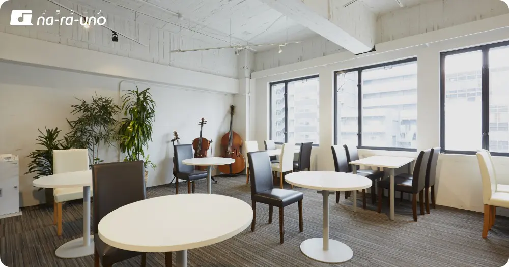 レッスン前後は開放感のあるラウンジで寛いでいただける広々とした音楽スタジオです♫
