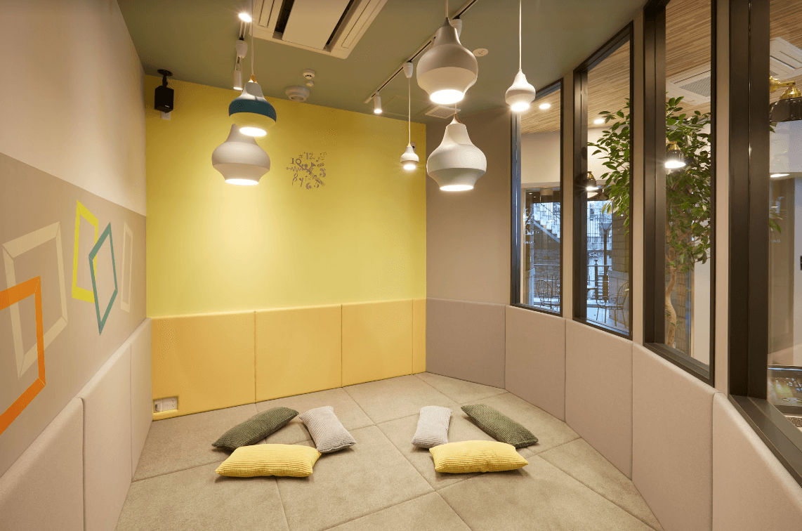 クッションに囲まれたキッズルームで先生と歌いながら身体を動かしたり、楽器に触ってみたり…楽しいレッスンです。