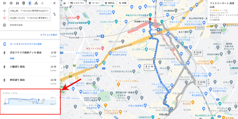 「いやいや、あまり坂道を歩きたくないから、ルート全体の高低差が知りたいよ」っていう方は、グーグルマップhttps://www.google.com/maps はいかがでしょう。ルート検索時に左下(赤く囲った部分)の高低差をチェック。ルートごとに確認でき、遊歩道なども加味されていて参考になります。他にも自転車ユーザーに人気の「坂の少ないルートを探せる地図」のサイトやアプリはたくさんあります。健康づくりの観点からも色々なタイプがあるので、自分のライフスタイルに合ったものを探してみるのもいいですね。