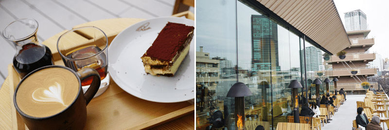 西郷山公園から坂を下って徒歩5分、海抜は30mから9mに。21m下った目黒川沿いの4F建て1棟丸ごとスタバでひと休み。テラスからは、西郷山公園も望めます。