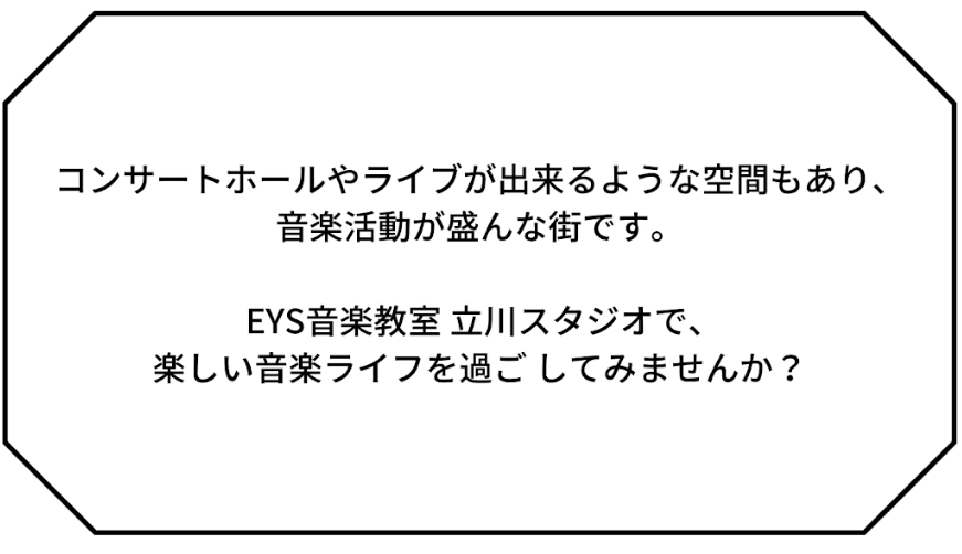 立川駅徒歩4分の駅チカ、南方向へ一本道を進むと、立川スタジオがあります。